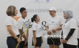 Direktur Utama PT Garuda Indonesia (persero) Tbk Ari Ashkara (kedua kanan) bersama Ketua Persatuan Squash Indonesia DKI Jakarta Amalia Chrisna Damayanti (kiri) berbincang dengan atlet muda squash di Lapangan Squash Gelora Bung Karno, Jakarta, Sabtu (27/7). (FOTO : Republika/Edwin Dwi Putranto)