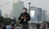 Warga menggunakan masker dengan latar belakang suasana gedung bertingkat yang diselimuti asap polusi di kawasan Sudirman, Jakarta, Senin (29/7). (FOTO : Republika/Putra M. Akbar)