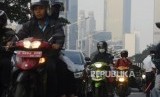 Pengendara motor menggunakan masker dengan latar belakang suasana gedung bertingkat yang diselimuti asap polusi di kawasan Sudirman, Jakarta, Senin (29/7). (FOTO : Republika/Putra M. Akbar)
