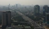 Kendaraan melintas dengan latar belakang suasana gedung bertingkat yang diselimuti asap polusi di kawasan Gatot Subroto, Jakarta, Senin (29/7). (FOTO : Republika/Putra M. Akbar)