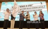 Ketua Komite Olimpiade Indonesia Erick Thohir menerima bendera Women In Sport Foundation dari Menteri Koordinator Bidang Pembangunan Manusia dan Kebudayaan Puan Maharani saat pembukaan acara Seminar Women In Sport di Jakarta, Rabu (31/7). (FOTO : Republika/Putra M. Akbar)