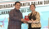 Ketua Komite Olimpiade Indonesia Erick Thohir memberikan cinderamata plakat kepada Menteri Koordinator Bidang Pembangunan Manusia dan Kebudayaan Puan Maharani saat pembukaan acara Seminar Women In Sport di Jakarta, Rabu (31/7). (FOTO : Republika/Putra M. Akbar)