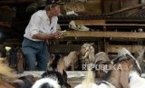 Pedagang memberi makan kambing yang dijual di Jalan Sabeni, Tanag Abang, Jakarta, Jumat (2/8). (FOTO : Republika/Putra M. Akbar)
