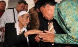 Ketua Majelis Syariah PPP KH Maimun Zubair (kiri) menyapa simpatisan PPP saat tiba dibandara Soekarno Hatta, Tangerang, Kamis (16/10/2014). (FOTO : Antara/Deni Santoso)
