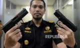 Petugas memperlihatkan senjata api barang sitaan Bea dan Cukai bersama PT Pos Indonesia (Persero) hasil pengawasan terhadap barang kiriman impor di Kantor Bea dan Cukai, Pasar Baru, Jakarta, Jumat (9/8). (FOTO : Republika/Putra M. Akbar)