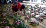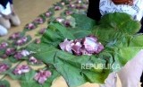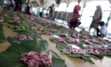 REPUBLIKA.CO.ID, YOGYAKARTA -- Panitia kurban membagi daging menggunakan daun jati di Masjid Margoyuwono, Yogyakarta, Ahad (11/8/2019).