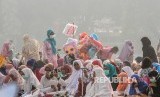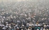Ribuan umat muslim melaksanakan Sholat Idul Adha di halaman Masjid Raya Annur dengan kondisi kabut asap karhutla yang menyelimuti Kota Pekanbaru, Riau, Minggu (11/8). Kabut asap dampak dari kebakaran hutan dan lahan yang masih terjadi di Provinsi Riau membuat kota Pekanbaru dan beberapa kabupaten lainya diselimuti kabut asap khususnya pada pagi hari. (FOTO : Ronny Muharman/Antara)