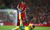 Roberto Firmino membantu Tom Trybull (bawah) yang cedera pada laga liga Inggris antara Liverpool melawan Norwich City di Anfield Stadium, Liverpool, Ahad (11/8) waktu setempat. (FOTO : Dave Thompson/AP )