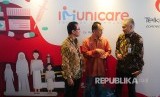 Direktur Utama TelkoMedika Bambang Lusmiadi (kiri), Direktur HCM Telkom Edi Witjara (tengah), dan Direktur SDM Biofarma Disril Revolin Putra (kanan) di sela peresmian outlet vaksin 'TelkoMedia Imunicare' di The Telkom Hub, Jakarta (12/08). Peluncuran ini merupakan implementasi sinergi BUMN, TelkoMedika selaku anak usaha PT Telkom bersama dengan PT Biofarma. (FOTO : Yogi Ardhi/Republika)