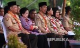 Presiden Joko Widodo (ketiga kiri) didampingi Ibu Negara Iriana Joko Widodo (ketiga kanan), Presiden ke-5 Megawati Soekarnoputri (kedua kiri) dan Ketua Kwartir Nasional Pramuka Budi Waseso (kiri) menghadiri upacara peringatan Hari Ulang Tahun (HUT) ke-58 Pramuka di Bumi Perkemahan Cibubur, Jakarta, Rabu (14/8) (FOTO : Wahyu Putro/Antara)