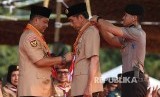 Presiden Joko Widodo (tengah) menerima penghargaan Tunas Kencana dari Ketua Kwartir Nasional Pramuka Budi Waseso (kiri) saat menghadiri upacara peringatan Hari Ulang Tahun (HUT) ke-58 Pramuka di Bumi Perkemahan Cibubur, Jakarta, Rabu (14/8) (FOTO : Wahyu Putro/Antara)