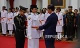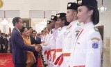 Presiden Joko Widodo bersalaman dengan anggota Pasukan Pengibar Bendera Pusaka (Paskibraka) seusai pengukuhan Paskibraka di Istana Negara, Jakarta, Kamis (15/8). (FOTO : Republika/Edwin Dwi Putranto)