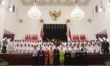 Presiden Joko Widodo berfoto bersama dengan anggota Pasukan Pengibar Bendera Pusaka (Paskibraka) seusai pengukuhan Paskibraka di Istana Negara, Jakarta, Kamis (15/8). (FOTO : Republika/Edwin Dwi Putranto)