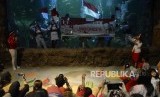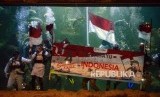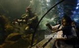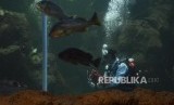 Pengunjung melihat penyelam tampil di dalam air (underwater) dalam rangka memperingati hari kemerdekaan Indonesia yang ke-74 di Seaworld, Ancol, Jakarta, Sabtu (17/8). (FOTO : Republika/Putra M. Akbar)