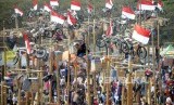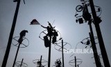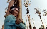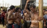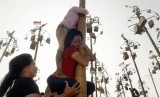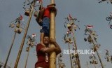 REPUBLIKA.CO.ID, JAKARTA -- Peserta mengikuti lomba panjat pinang kolosal pada HUT ke-74 Kemerdekaan RI di Pantai Karnaval Ancol, Jakarta, Sabtu (17/8).