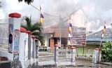 Asap membumbung dari gedung kantor Dewan Perwakilan Rakyat Daerah (DPRD) Papua Barat di Manokwari, yang dibakar massa, Senin (19/8) (FOTO : Toyiban/Antara)