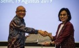 Menteri Keuangan Sri Mulyani (kanan) bersama Kepala Badan Kepegawaian Negara (BKN) Bima Haria Wibisana berjabat tangan saat penandatanganan nota kesepahaman antara Kementerian Keuangan dengan BKN di kantor Kementerian Keuangan, Jakarta, Senin (19/8/2019). (FOTO : ANTARA FOTO)