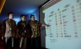 Direktur Syariah Bank CIMB Niaga Pandji P Djajanegara (kanan) bersama Kepala Bank CIMB Niaga Regional Kalimantan dan Indonesia Timur Alip Hanoky (kiri) dan Kepala SME IV Bank CIMB Niaga area Kalimantan dan Indonesia Timur Roby Cokro (tengah) memperlihatkan grafik perbankan saat menghadiri diskusi bersama wartawan di Makassar, Sulawesi Selatan, Rabu (21/8/2019). (FOTO : Republika/Tahta Aidilla)