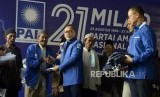 Ketua Umum PAN Zulkifli Hasan bersama Ketua Dewan Kehormatan Amien Rais dan Sekjen Eddy Soeparno saat menghadiri perayaan HUT ke-21 PAN di Pluit, Jakarta, Jumat (23/8/2019). (FOTO : Republika/Putra M. Akbar)