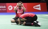 Ekspresi kegembiraan Ganda Putri Indonesia Apriyani Rahayu (kiri) dan Greysia Polii usai mengalahkan ganda putri China Chen Qing Chen dan Jia Yi Fan pada babak perempat final Kejuaraan Dunia Bulu Tangkis 2019 di St. Jakobshalle, Basel, Swiss, Jumat (23/8) (FOTO : Hafidz Mubarak/Antara)