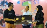 GM Loka Mampang Indah Realty Agus Sumitro (kiri) bersama Deputy GM Loka Mampang Realty Planiar Y. Budhi (kanan) dan Kepala Cabang BCA Arkadia Toga Sinaga berbincang saat acara ulang tahun perdana De Entrance sekaligus launching kartu De Card Flazz di Jakarta, Sabtu (24/8). (FOTO : Republika/Edwin Dwi Putranto)
