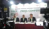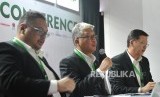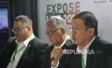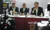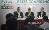 Sekertaris Perusahaan PT Adaro Energy Tbk Mahardika Putranto, Direktur Legal PT Adaro Energy Tbk M Syah Indra Man dan Chief Financial Officer PT Adaro Energy Tbk Lie Luckman (Dari kiri) berbicara usai Public Expose Live 2019 di BEI, Jakarta, Senin (26/8). (FOTO : Tahta Aidilla/Republika)