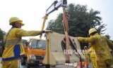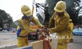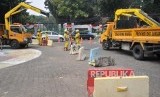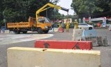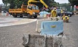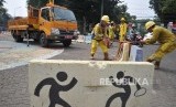 REPUBLIKA.CO.ID, JAKARTA -- Petugas sedang menata kembali pembatas jalan beton di kawasan Tugu Proklamasi, Jakarta Pusat, Senin (26/8).
