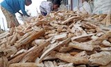Warga mengemas gaplek ke dalam karung untuk dijual kepada produsen tepung tapioka seharga Rp3.500 per kilogram di Desa Selopanggung, Kediri, Jawa Timur, Senin (26/8/2019). (FOTO : ANTARA FOTO)