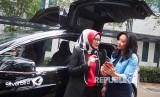 Direktur Utama Telkomsel Emma Sri Martini (kiri) dan Direktur Utama PT Blue Bird Tbk Noni Purnomo mendiskusikan app Bluebird di depan unit taksi listrik Tesla Silverbird di Jakarta, Senin (26/8/2019). Kedua pihak bekerjasama memanfatkan layanan solusi bisnis korporasi Telkomsel berbasis teknologi Internet of Things untuk menunjang operasional bisnis Blue Bird Group. (FOTO : Yogi Ardhi/Republika)
