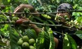 Pekerja memetik biji kopi di perkebunan rakyat sumarorong, Kabupaten Mamasa, Sulawesi Barat, Kamis (29/8/2019). (FOTO : Antara/Akbar Tado)