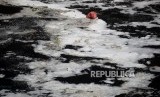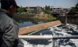Petugas mengamati kondisi aliran air sungai yang berbusa di kali Cipinang, Banjir Kanal Timur,Jakarta, Jumat (30/8). (FOTO : Republika/Prayogi)