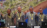 Direktur Utama PT Perusahaan Gas Negara Tbk (PGN) Gigih Prakoso Soewarto (kedua kanan) bersama Komisaris Utama IGN Wiramaja Puja (kedua kiri), Komisaris Independen Kiswodarmawan (kiri) dan Direktur Keuangan Said Reza Pahlevy mengepalkan tangan sebelum mengikuti Rapat Umum Pemegang Saham Luar Biasa (RUPSLB) PGN di Jakarta, Jumat (30/8/2019). (FOTO : Antara/Wahyu Putro A)