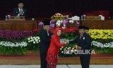 Ketua DPRD Jawa Barat periode 2014-2019 Ineu Purwadewi Sundari (kiri) memberikan palu sidang kepada Ketua DPRD sementara Taufik Hidayat (kanan) saat pelantikan anggota DPRD Jawa Barat terpilih, di Gedung Merdeka, Kota Bandung, Senin (2/9). (FOTO : Republika/Edi Yusuf)