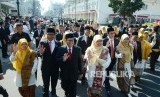 Wali Kota Bandung Oded M Danial bersama para anggota DPRD Jabar terpilih berjalan kaki dari Hotel Hotel Savoy Homann saat hadir dalam pelantikan anggota DPRD Jawa Barat terpilih, di Gedung Merdeka, Kota Bandung, Senin (2/9). (FOTO : Republika/Edi Yusuf)