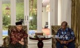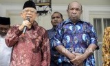 Wakil Presiden terpilih Maruf Amin bersama Ketua Perwakilan Pendeta Papua Richard Tonjau memberikan keterangan kepada wartawan usai melakukan pertemuan di Jakarta, Kamis (5/9). (FOTO : Republika/Putra M. Akbar)