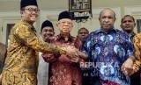 Wakil Presiden terpilih Maruf Amin bersama Ketua Perwakilan Pendeta Papua Richard Tonjau dan Ketua Gerakan Nasionalis Religius Bobby S. Hendrawan saling menggegam tangan usai melakukan pertemuan di Jakarta, Kamis (5/9). (FOTO : Republika/Putra M. Akbar)