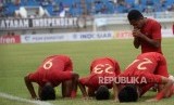 Timnas U23 Juara Trofeo HB X. Pemain Timnas U23 melakukan selebrasi usai menccetak gol ke gawang Bali United pada pertandingan Trofeo HBX 2019 di Stadion Mandala Krida, Yogyakarta, Ahad (8/9/2019). (FOTO : Republika/ Wihdan)