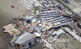 Sebuah rumah di pesisir selatan Kota Tokyo rusak dihantam badai Faxai, Senin (9/9). Badai menyebabkan berbagai fasilitas kota, dan kegitatan warga kota terganggu. (FOTO : Kyodo News via AP)