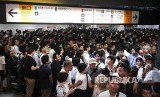 Penumpang kereta kommuter menunggu stasiun Shinjuku Station dibuka menyusul ditutupknya layananan kereta saat Badai Faxai melintasi Tokyo, Senin (9/9). (FOTO : Jae C Hong/AP)