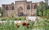 Warga melintas di depan bangunan madrasah di komplek kota tua Hisor (Hissar), Tajikistan, Selasa (10/9/2019). (FOTO : Antara/Prasetyo Utomo)