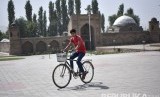 Seorang warga bersepeda melintas di depan bangunan madrasah di komplek kota tua Hisor (Hissar), Tajikistan, Selasa (10/9/2019). (FOTO : Antara/Prasetyo Utomo)