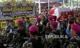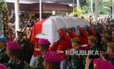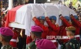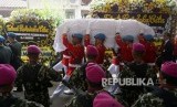 REPUBLIKA.CO.ID, JAKARTA -- Personil TNI membawa peti jenazah almarhum Presiden ke-3 BJ Habibie saat upacara pelepasan militer di Patra Kuningan, Jakarta, Kamis (12/9).