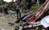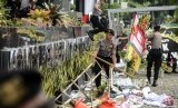 Anggota kepolisian membersihkan sisa karangan bunga pasca kericuhan di depan gedung KPK, Jakarta, Jumat (13/9). (FOTO : Republika/Putra M. Akbar)