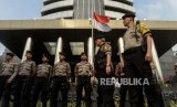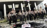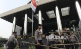 Anggota kepolisian berjaga pasca kericuhan di depan gedung KPK, Jakarta, Jumat (13/9). (FOTO : Republika/Putra M. Akbar)