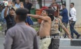 Polisi menahan massa aksi pasca kericuhan di depan gedung KPK, Jakarta, Jumat (13/9). (FOTO : Republika/Putra M. Akbar)