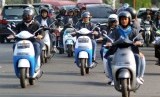 Sejumlah karyawan mencoba motor listriik saat sosialisasi Motor Listrik on the road, di Padang, Sumatera Barat, Sabtu (14/9/2019). (FOTO : ANTARA FOTO)
