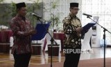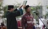 Direktur Penuntutan KPK terpilih Fitroh Rohcahyanto (kanan) saat mengucapkan sumpah pada pelantikan pejabat struktural di Gedung Merah Putih KPK, Jakarta, Senin (16/9). (FOTO : Republika/Putra M. Akbar)