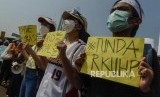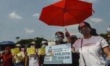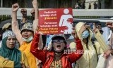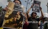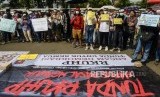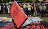 Sejumlah massa yang tergabung dalam Aliansi Masyarakat untuk Keadilan Demokrasi saat aksi menolak Rancangan Kitab Undang-undang Hukum Pidana (RKUHP) di depan gedung DPR, Senayan, Jakarta, Senin (16/9). (FOTO : Republika/Putra M. Akbar)