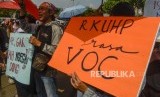 REPUBLIKA.CO.ID, JAKARTA -- Sejumlah massa yang tergabung dalam Aliansi Masyarakat untuk Keadilan Demokrasi saat aksi menolak Rancangan Kitab Undang-undang Hukum Pidana (RKUHP) di depan gedung DPR, Senayan, Jakarta, Senin (16/9).