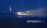 Pesawat Kepresidenan yang membawa Presiden Joko Widodo dan rombongan mendarat mulus di tengah kabut asap kebakaran hutan dan lahan (karhutla) yang menyelimuti Bandara Sultan Syarif Kasim II, Kota Pekanbaru, Riau, Senin petang (16/9/2019). (FOTO : Antara/FB Anggoro)